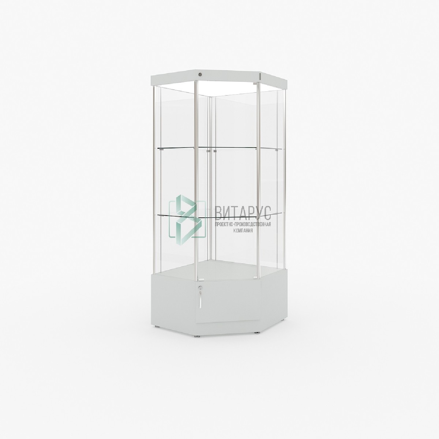 Витрина профильная вертикальная угловая полного обзора со световым блоком на тумбе