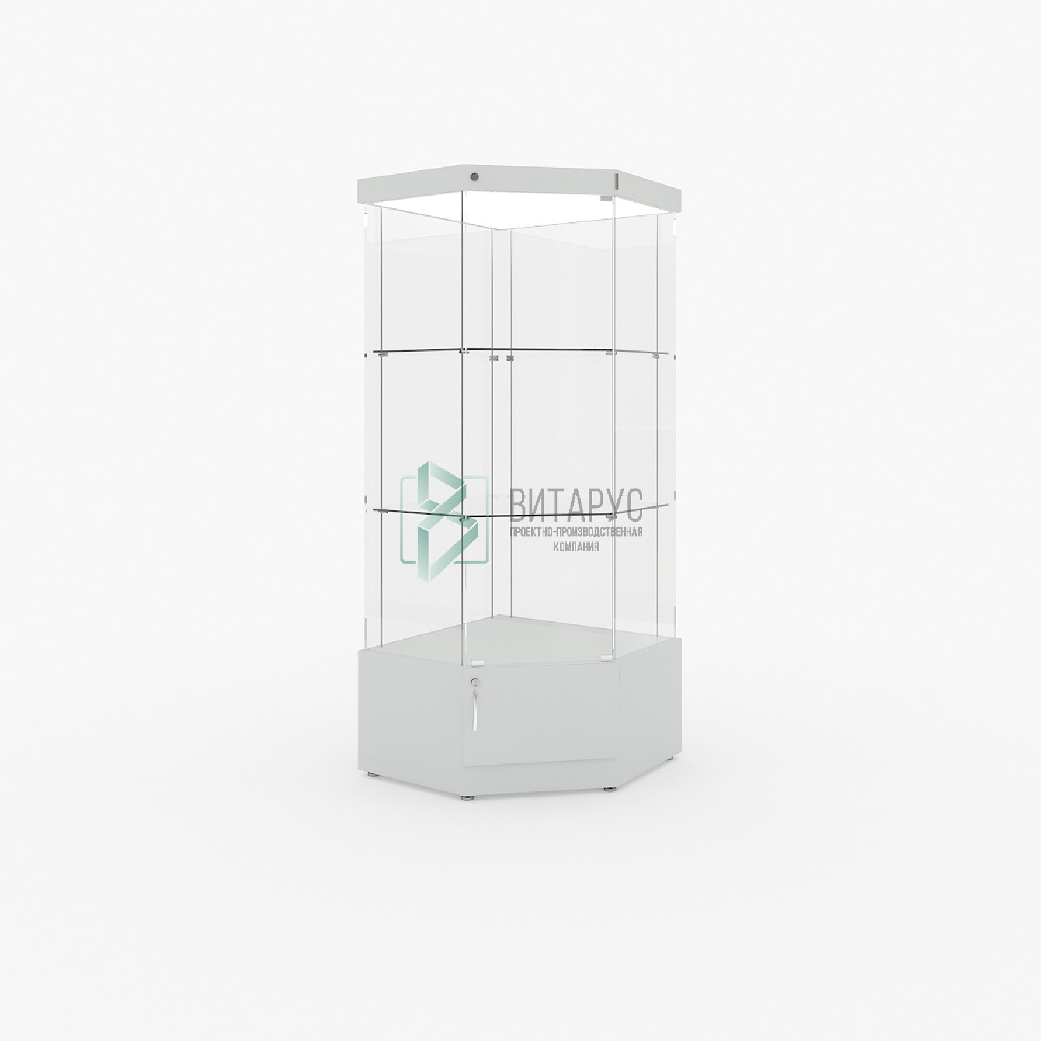 Витрина экспозиционная вертикальная угловая полного обзора со световым блоком на тумбе