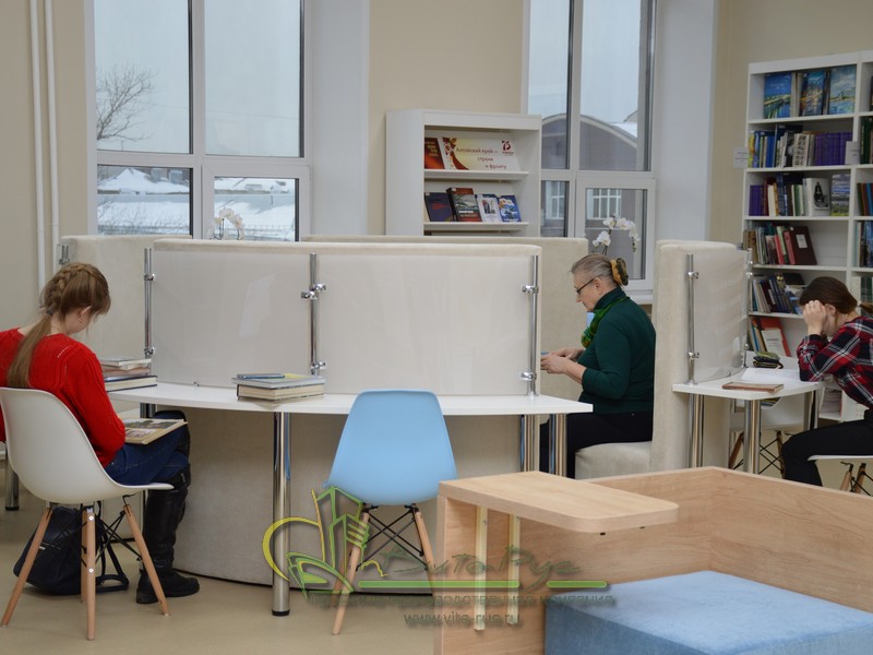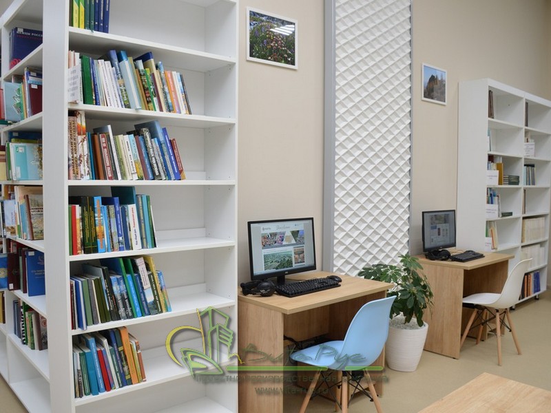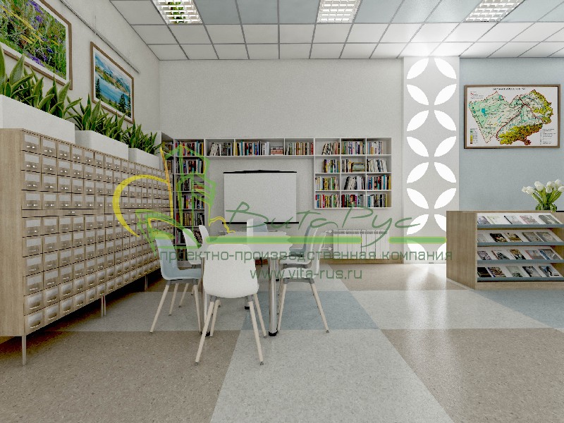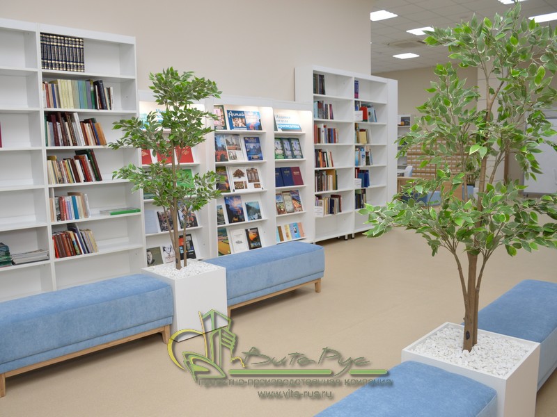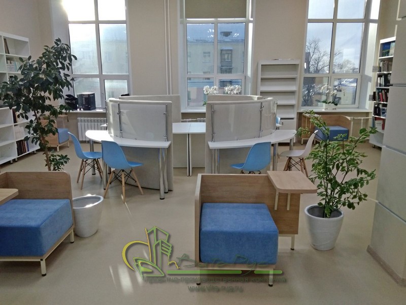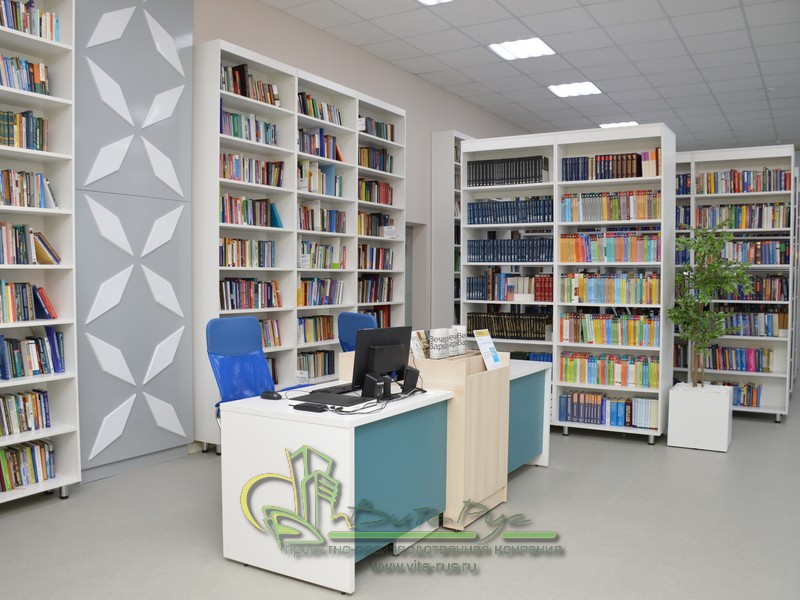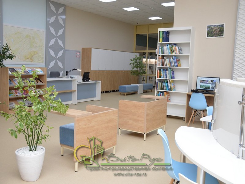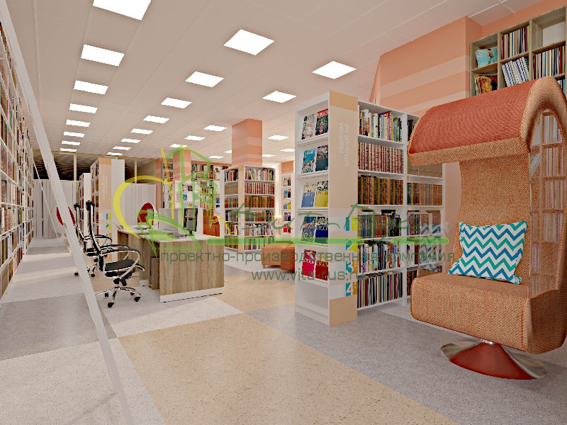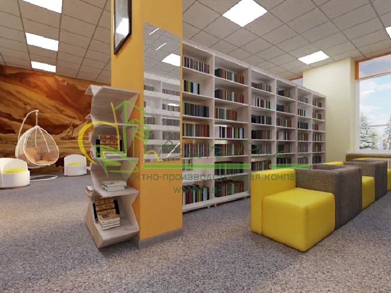 В этом проекте реализованы современные тенденции библиотечных пространств, сочетание дерева и металла. Стеллажи, оснащенные передвижными металлическими лестницами, позволяют рачительно использовать пространство библиотеки и с легкостью достать нужную книгу с самой высокой полки. Формулярные шкафы дополнены фитоостровками, и оживляют пространство. Мягкие кресла с высокими спинками дополняются удобными пуфами, и придают особенный шарм интерьеру. Каталожные и формулярные шкафы, а также стеллажи для периодики, подобраны исходя из количества фондов и в соответствии с общим стилем библиотеки. А подоконники стали уютными местами для чтения.