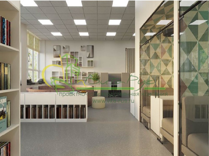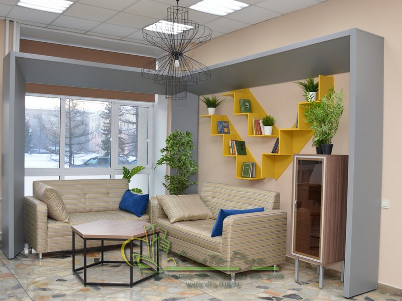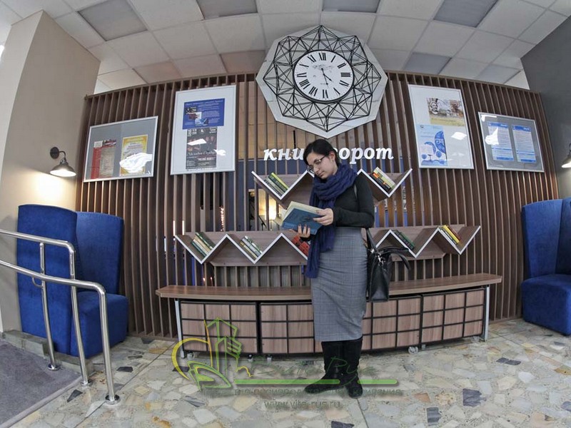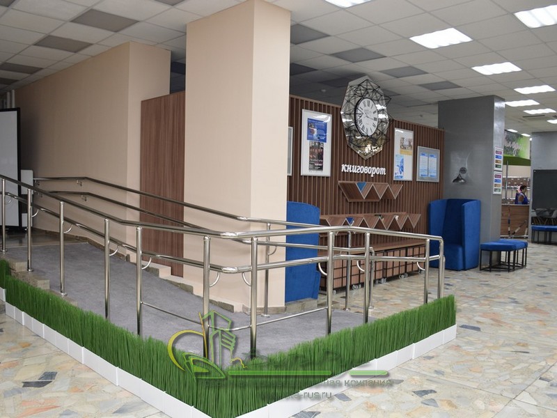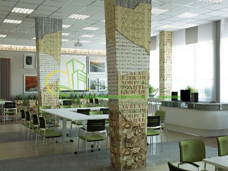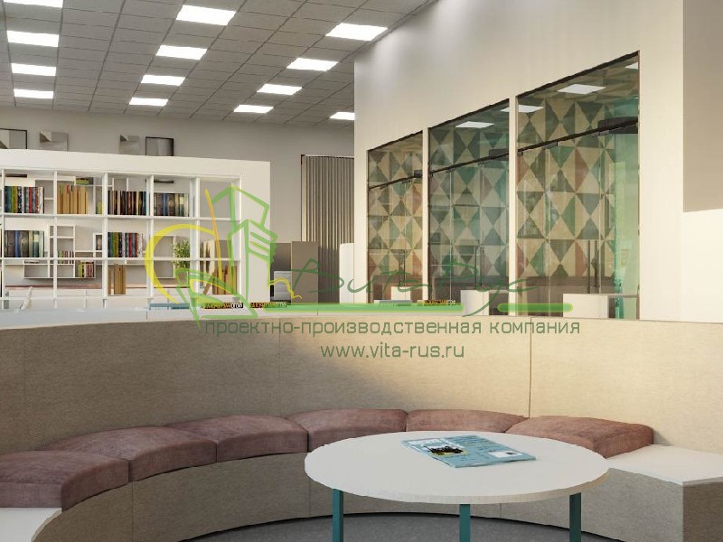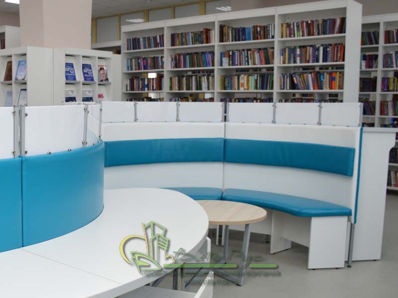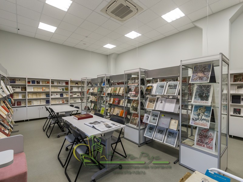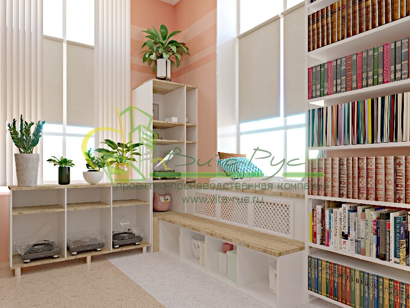В этом проекте реализованы современные тенденции библиотечных пространств, сочетание дерева и металла. Стеллажи, оснащенные передвижными металлическими лестницами, позволяют рачительно использовать пространство библиотеки и с легкостью достать нужную книгу с самой высокой полки. Формулярные шкафы дополнены фитоостровками, и оживляют пространство. Мягкие кресла с высокими спинками дополняются удобными пуфами, и придают особенный шарм интерьеру. Каталожные и формулярные шкафы, а также стеллажи для периодики, подобраны исходя из количества фондов и в соответствии с общим стилем библиотеки. А подоконники стали уютными местами для чтения.