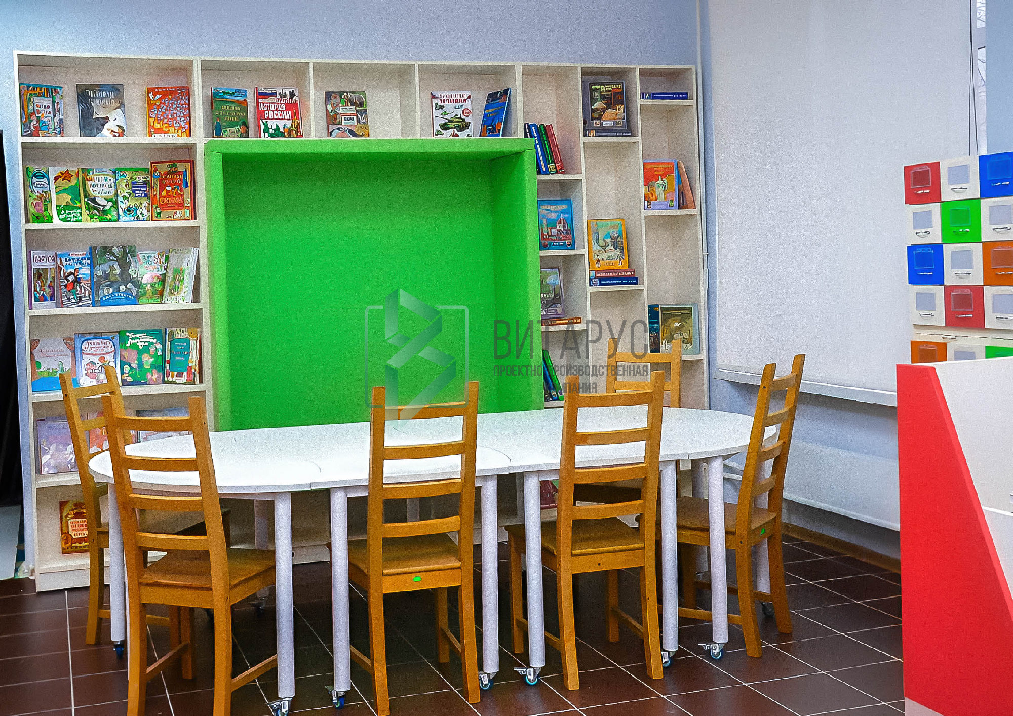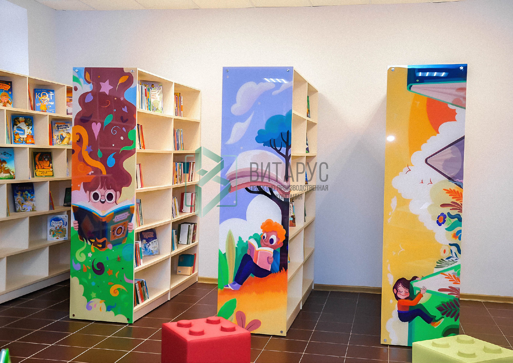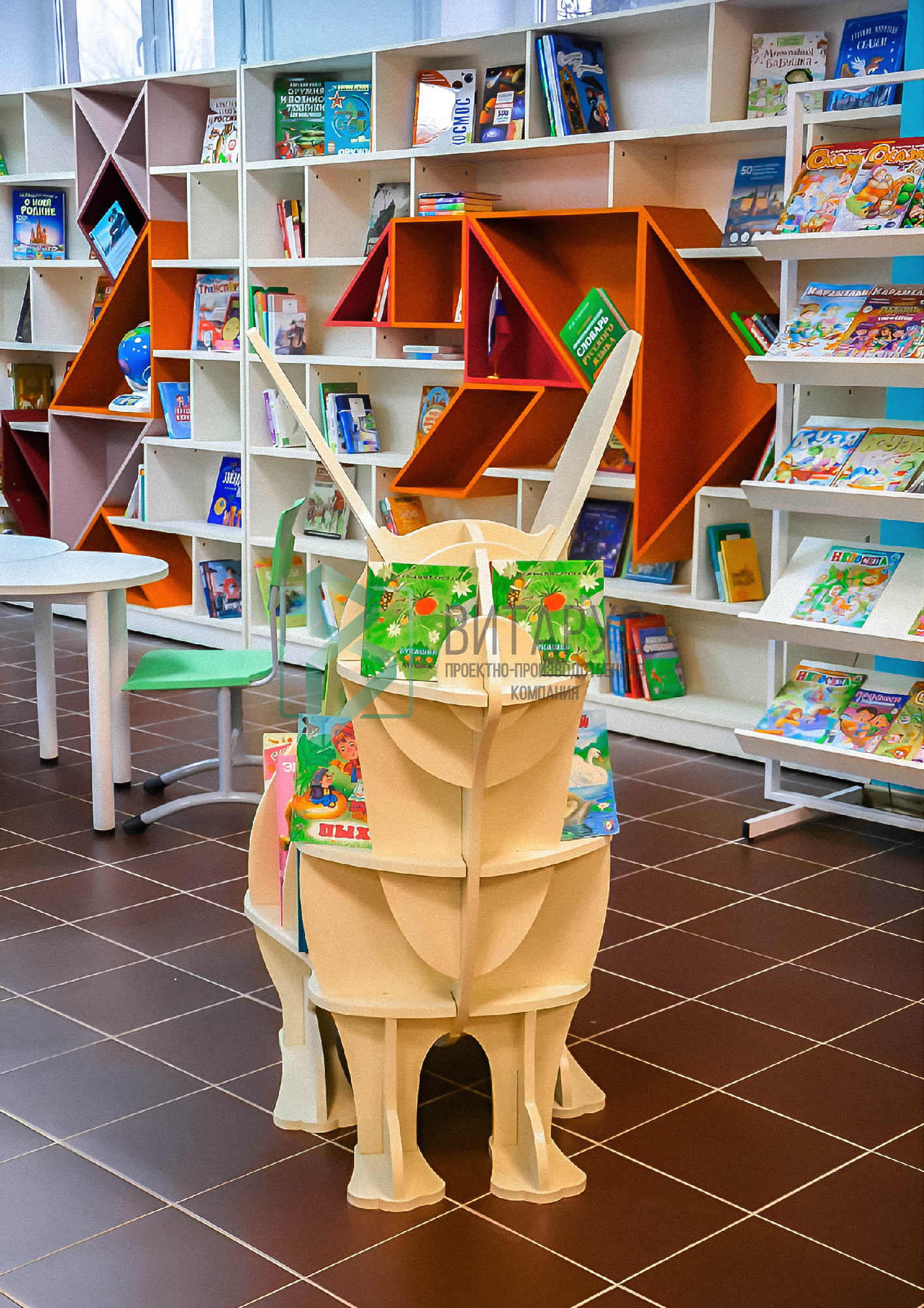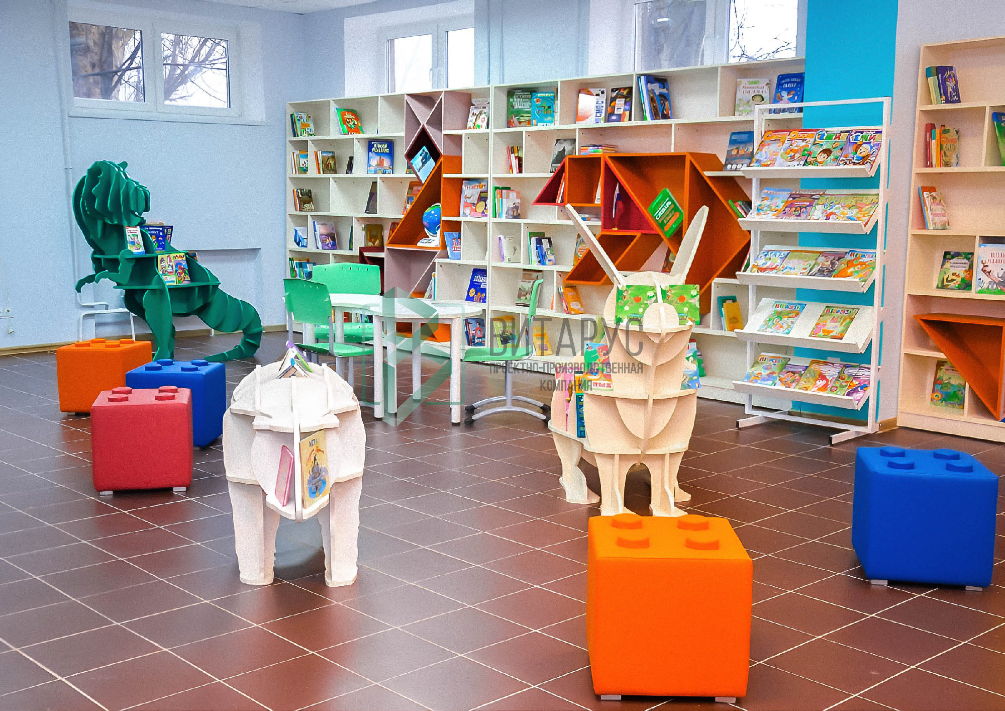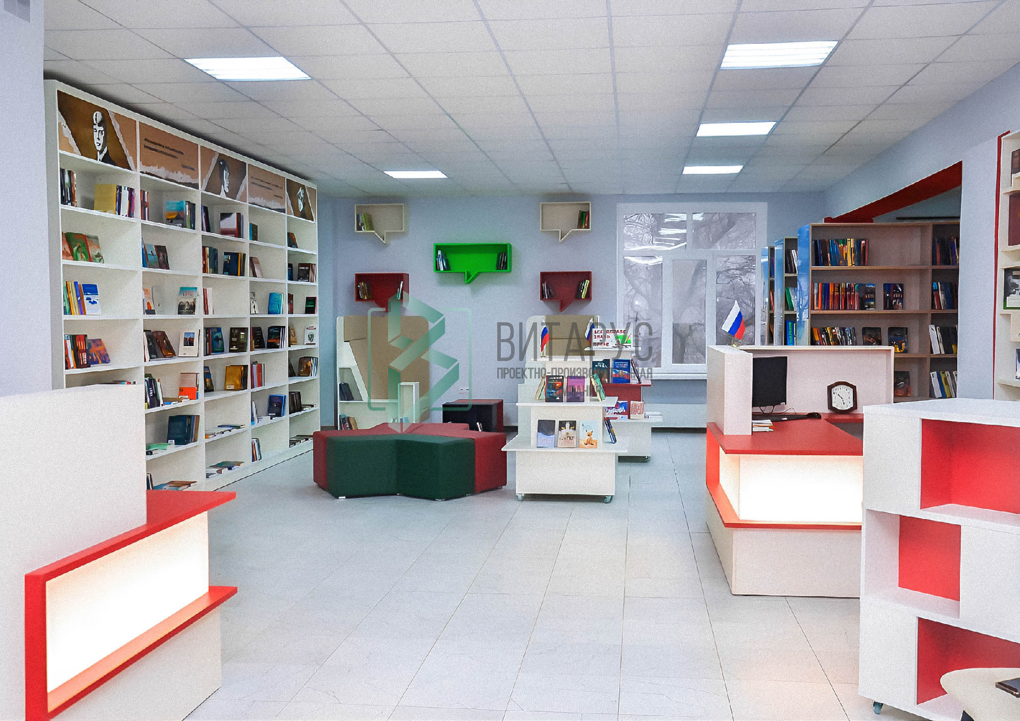 Концепция предполагала необычные решения, которые захватят внимание маленьких читателей. Библиотека преобразилась, стала светлой и яркой, а эргономичное библиотечное оборудование сделали ее приятной не только для посетителей, но и для сотрудников библиотеки.