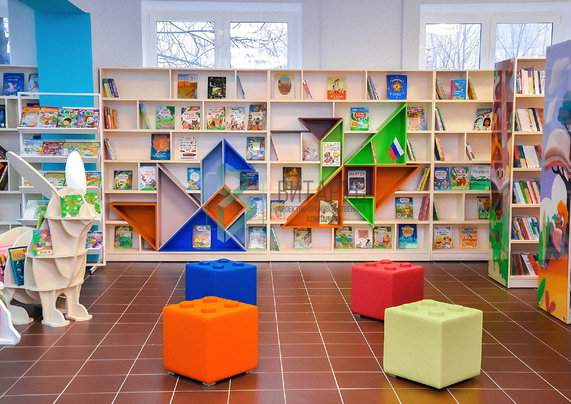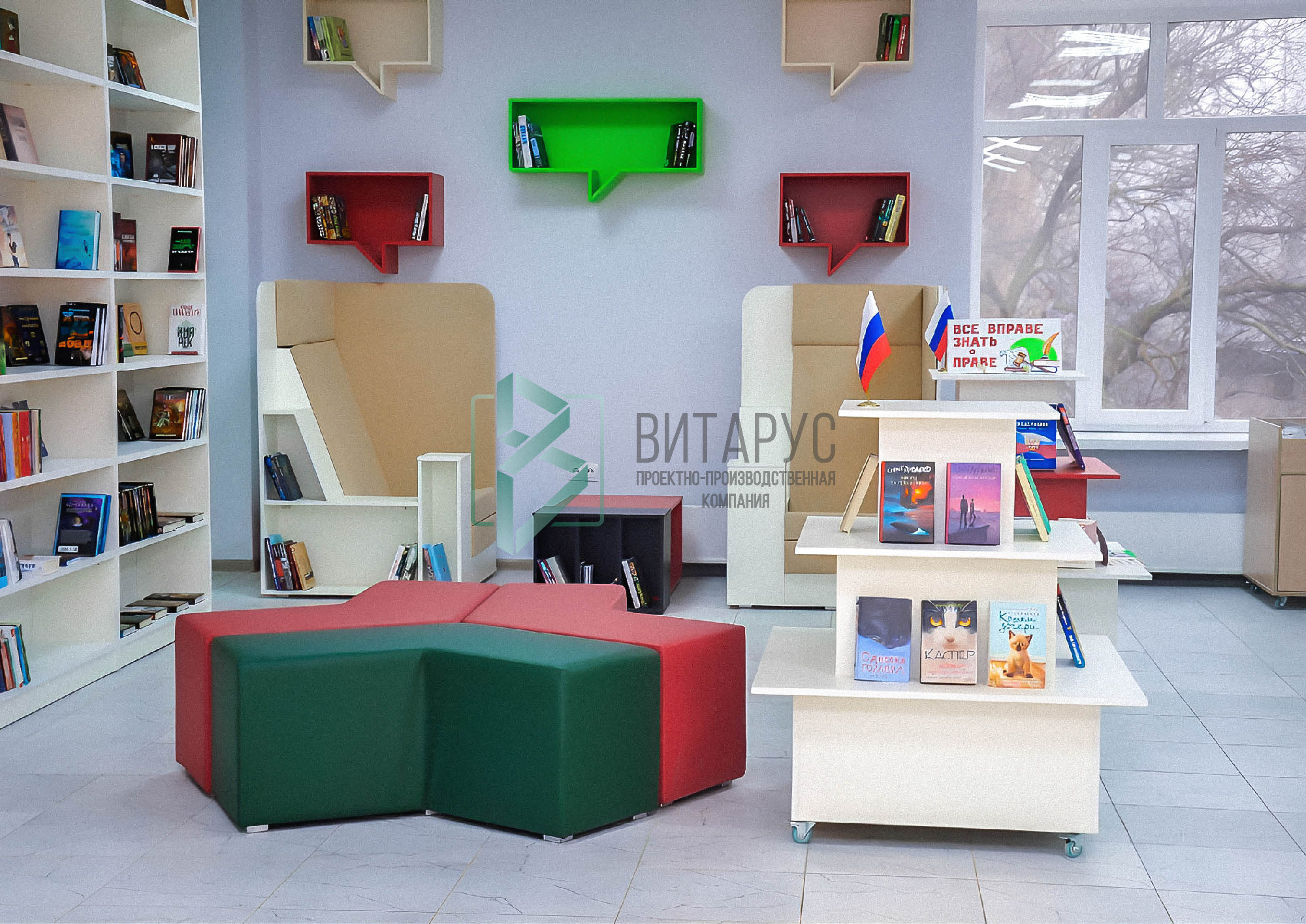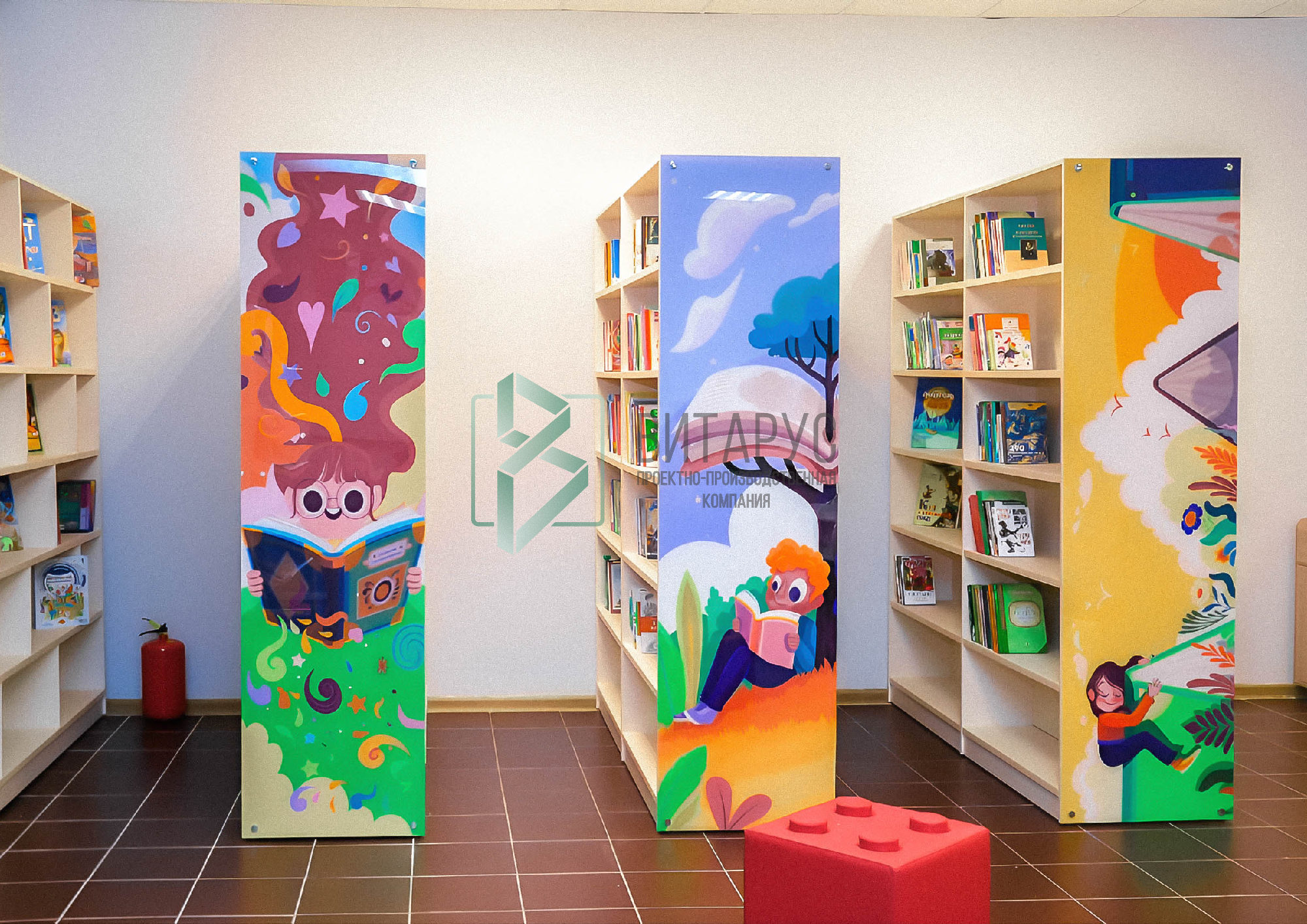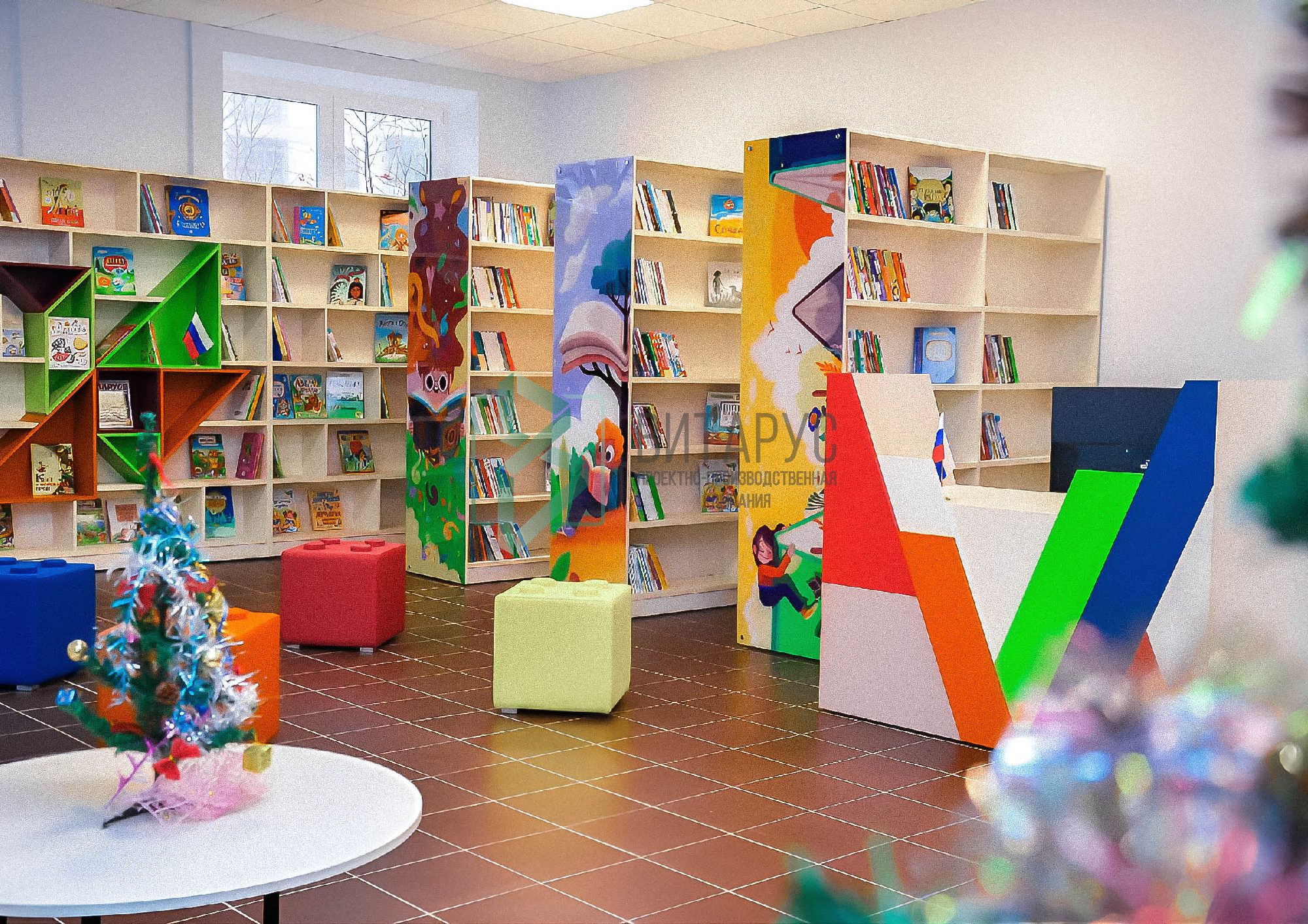 Концепция предполагала необычные решения, которые захватят внимание маленьких читателей. Библиотека преобразилась, стала светлой и яркой, а эргономичное библиотечное оборудование сделали ее приятной не только для посетителей, но и для сотрудников библиотеки.
