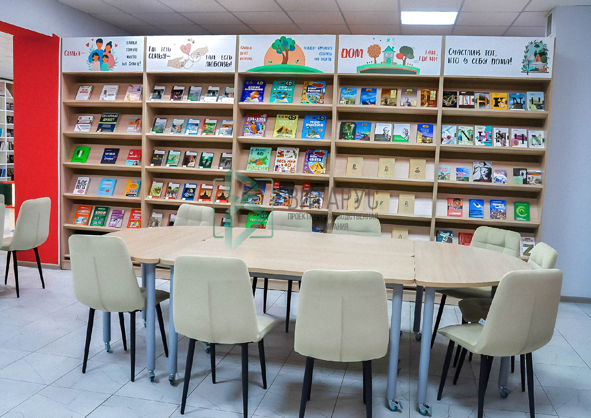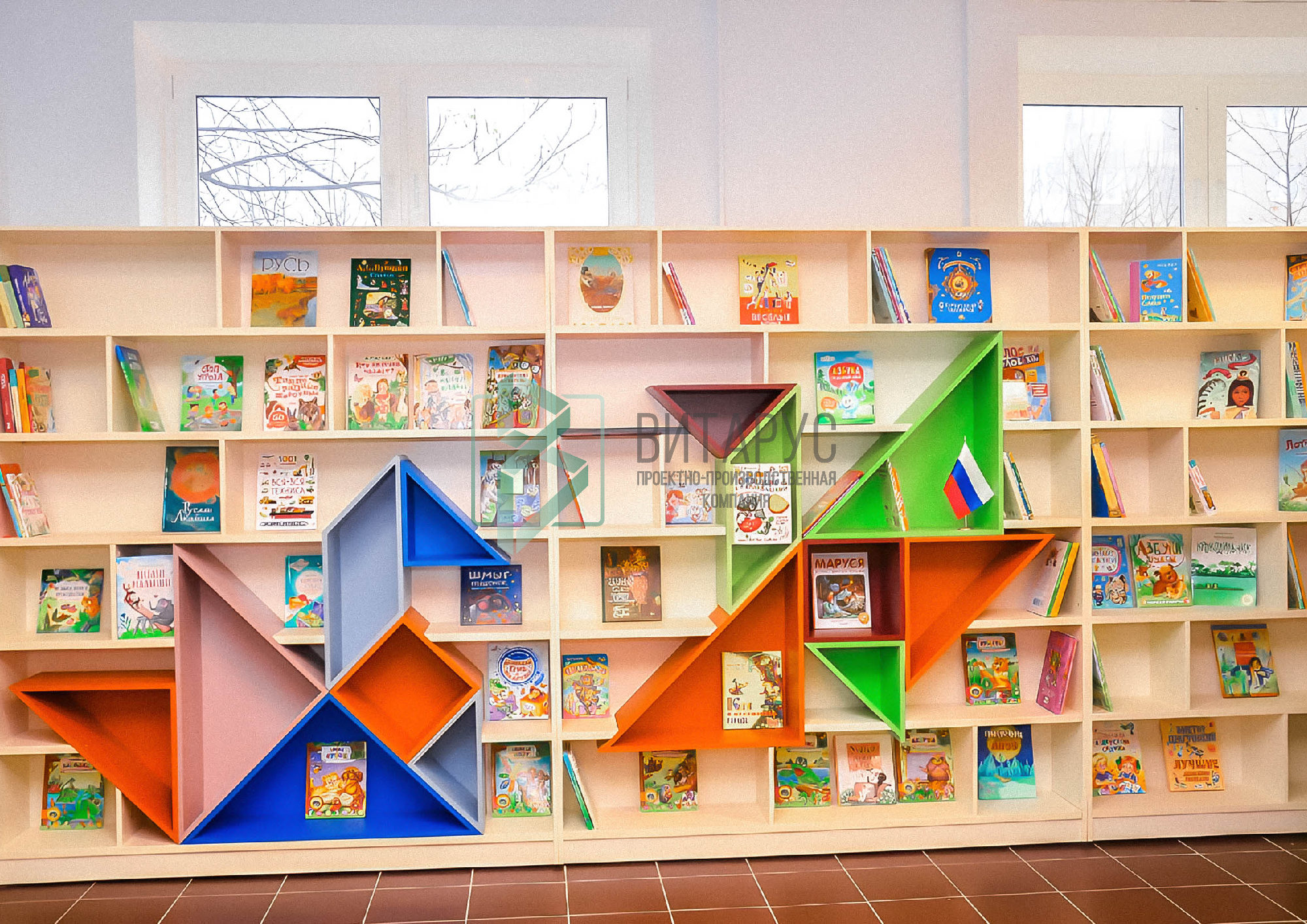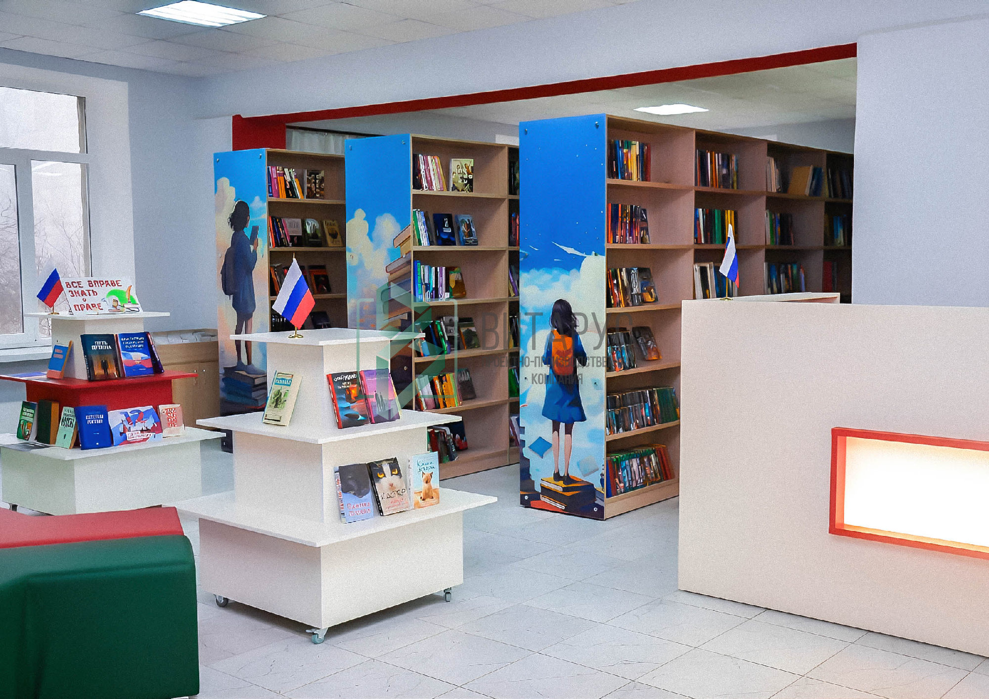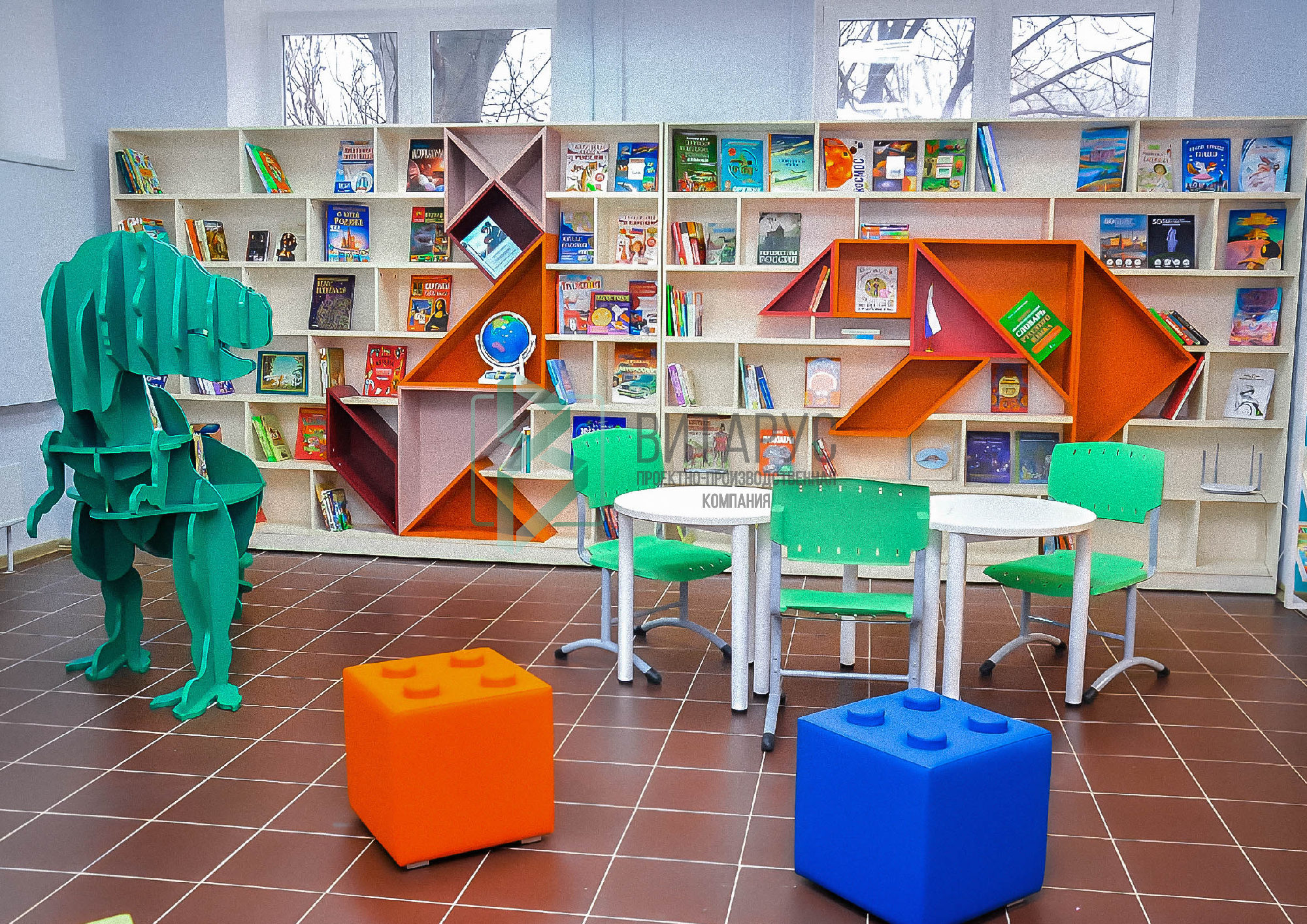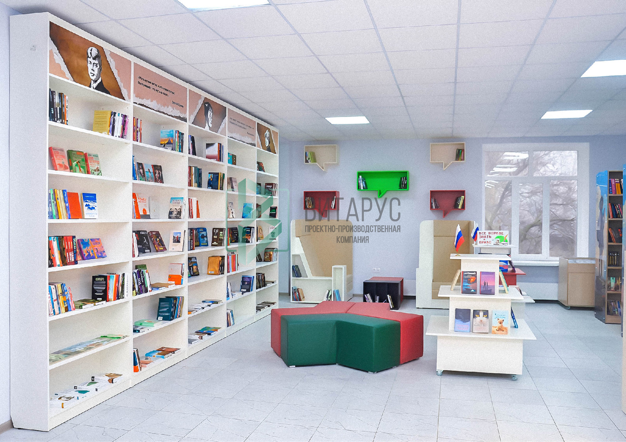 Концепция предполагала необычные решения, которые захватят внимание маленьких читателей. Библиотека преобразилась, стала светлой и яркой, а эргономичное библиотечное оборудование сделали ее приятной не только для посетителей, но и для сотрудников библиотеки.