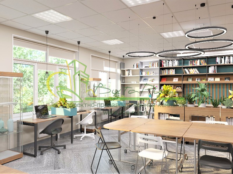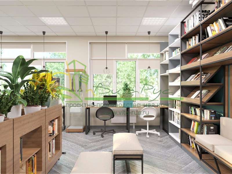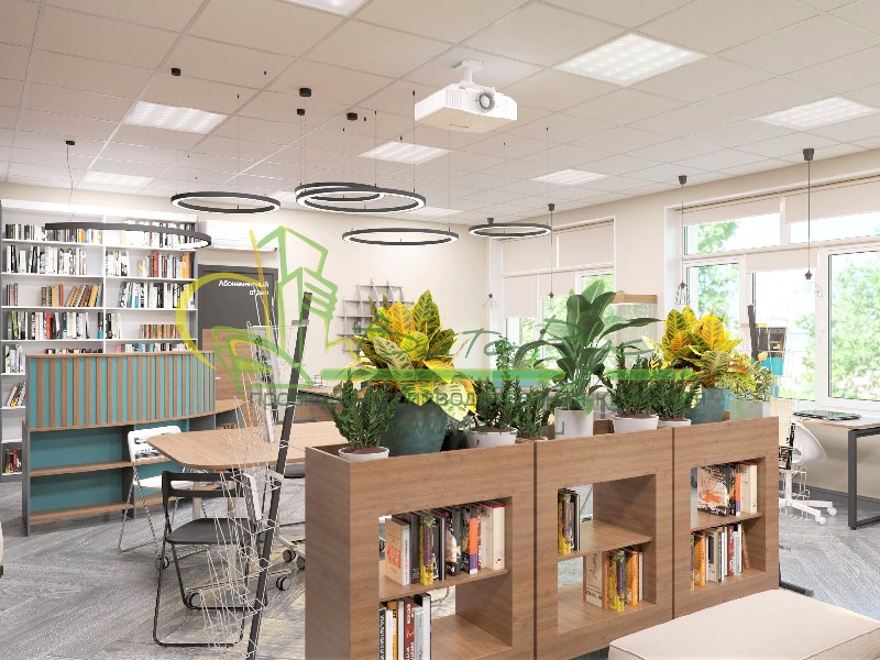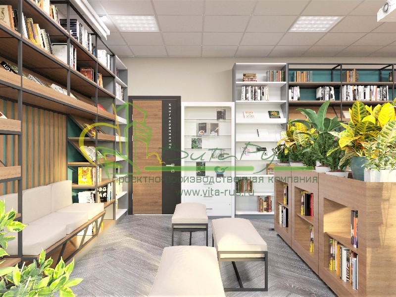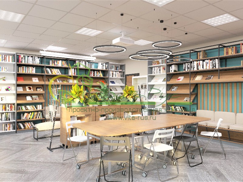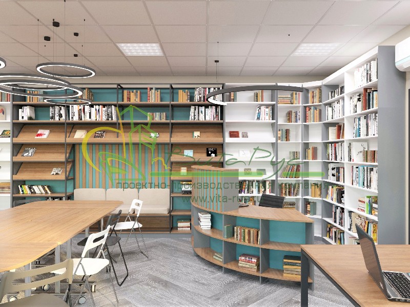 Модерновое библиотечное пространство. Функциональная библиотечная кафедра, повышает эффективность работы библиотекаря. Авторские библиотечные стеллажи с мягкими посадочными местами, и мобильные читательские столы и кресла делают процесс чтения удобным и приятным. Музейные витрины позволяют представить посетителям выставочные экспонаты. Мобильные стеллажи с фито-островками оживляют библиотечное пространство.