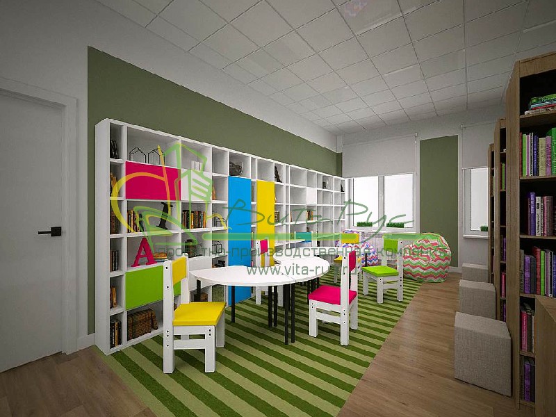 Стильное интерьерное решение для библиотеки в Тульской области. Библиотечная мебель из металла и современных плитных материалов, стеллажи с наклонными полками, современные читательские столы и стулья, лаконичная и эргономичная мягкая мебель. Такое библиотечное пространство не оставит равнодушным ни одного читателя. Яркая детская зона, место притяжения для любого ребенка.