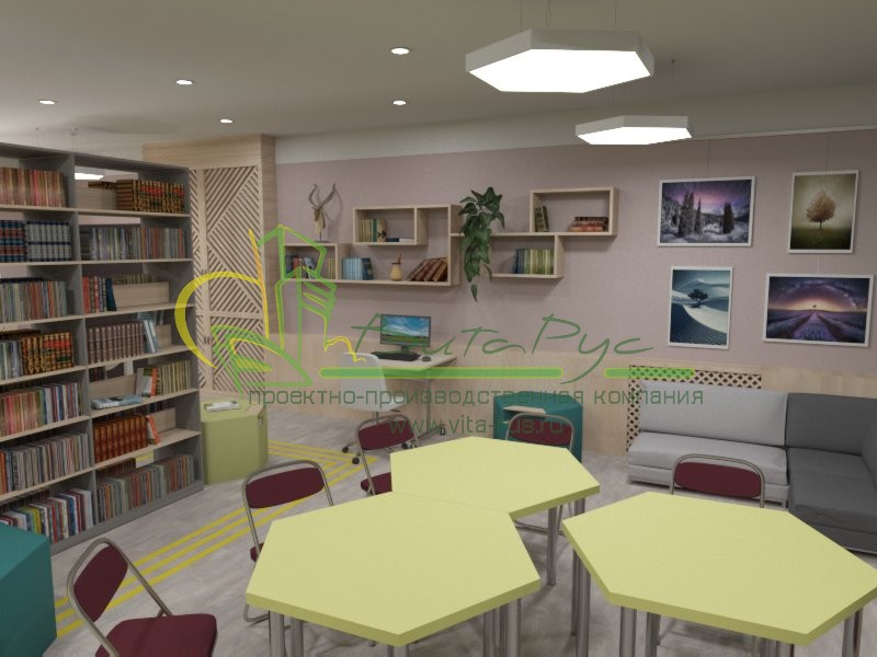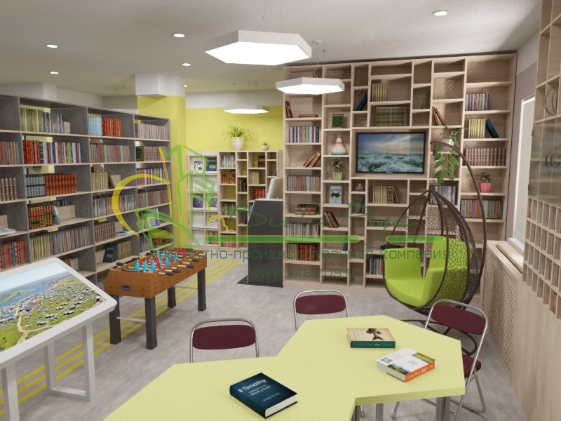 Модерновый проект, библиотеки в поселке Тазовский расположенном Ямало-Ненецком автономном округе. Современная эргономичная библиотечная мебель, которая позволяет трансформировать пространство библиотеки. Креативные библиотечные стеллажи, тщательно подобранные цвета материалов, индивидуальные посадочные места делают библиотечное пространство по-настоящему эстетичным и привлекательным для читателей.