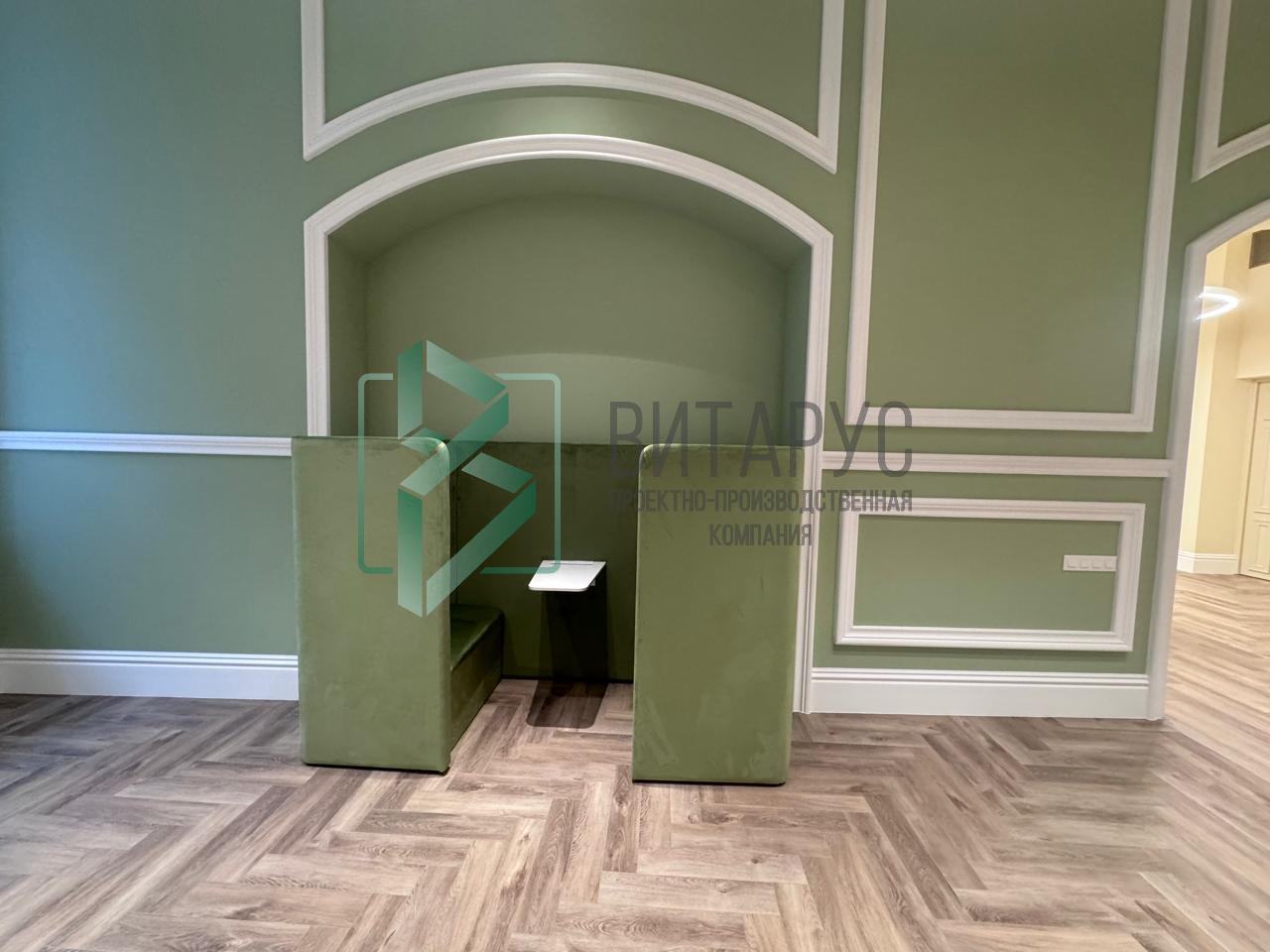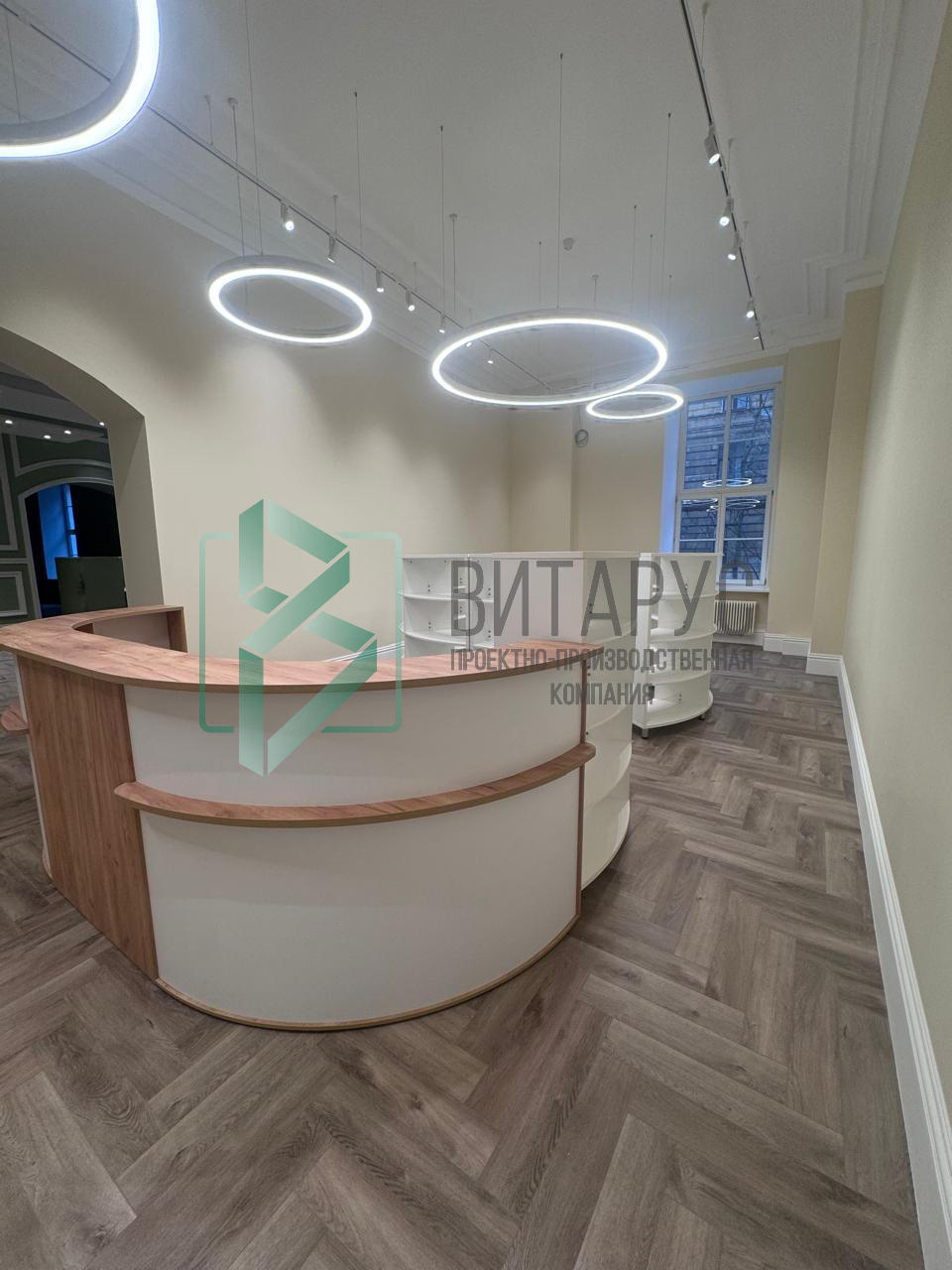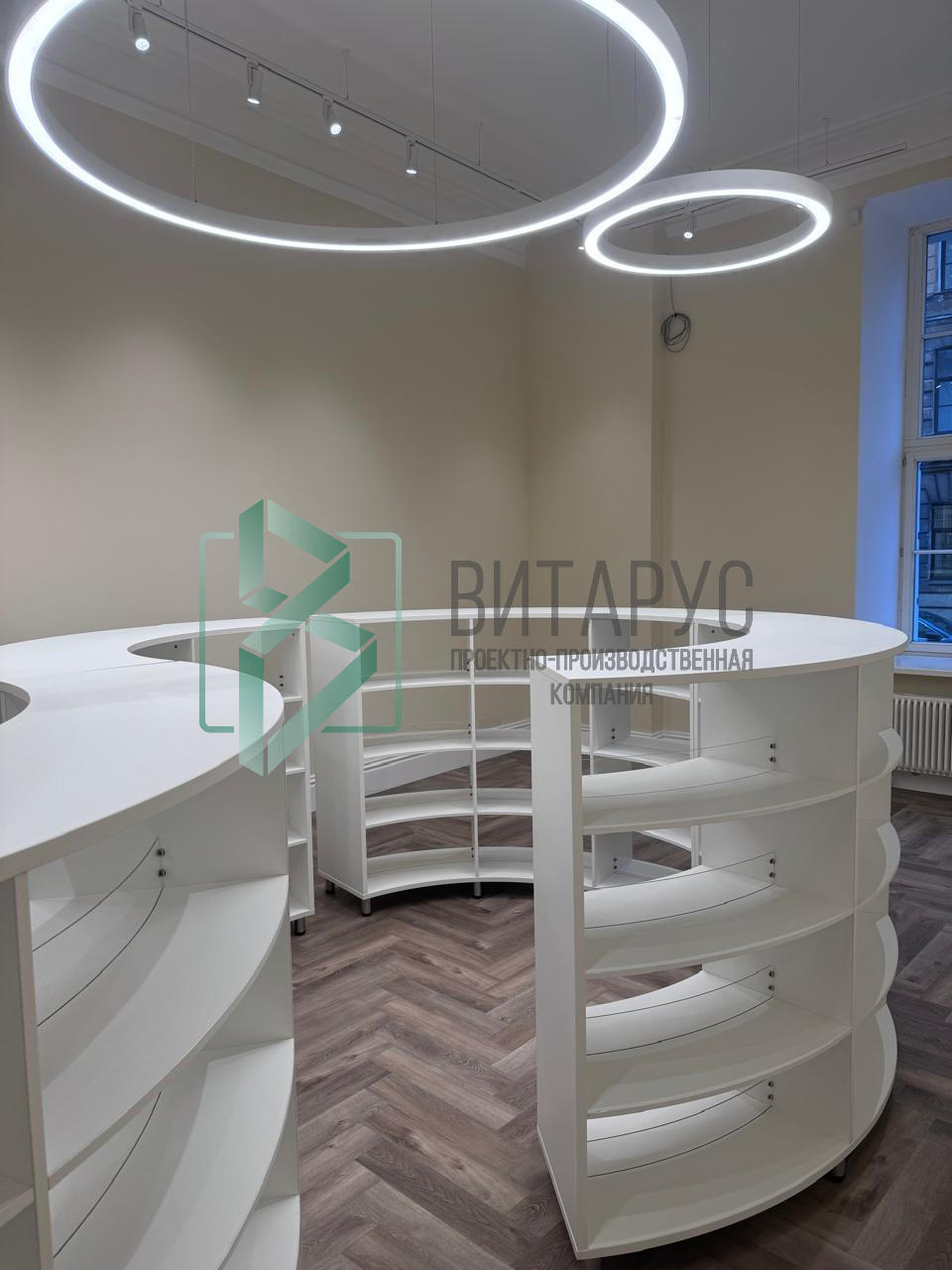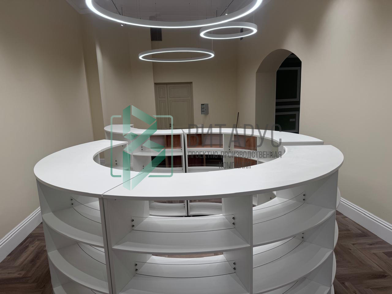 Оборудование для постоянного партнера. Нестандартные S-образные стеллажи, кабины для индивидуальной работы, эргономичная кафедра.